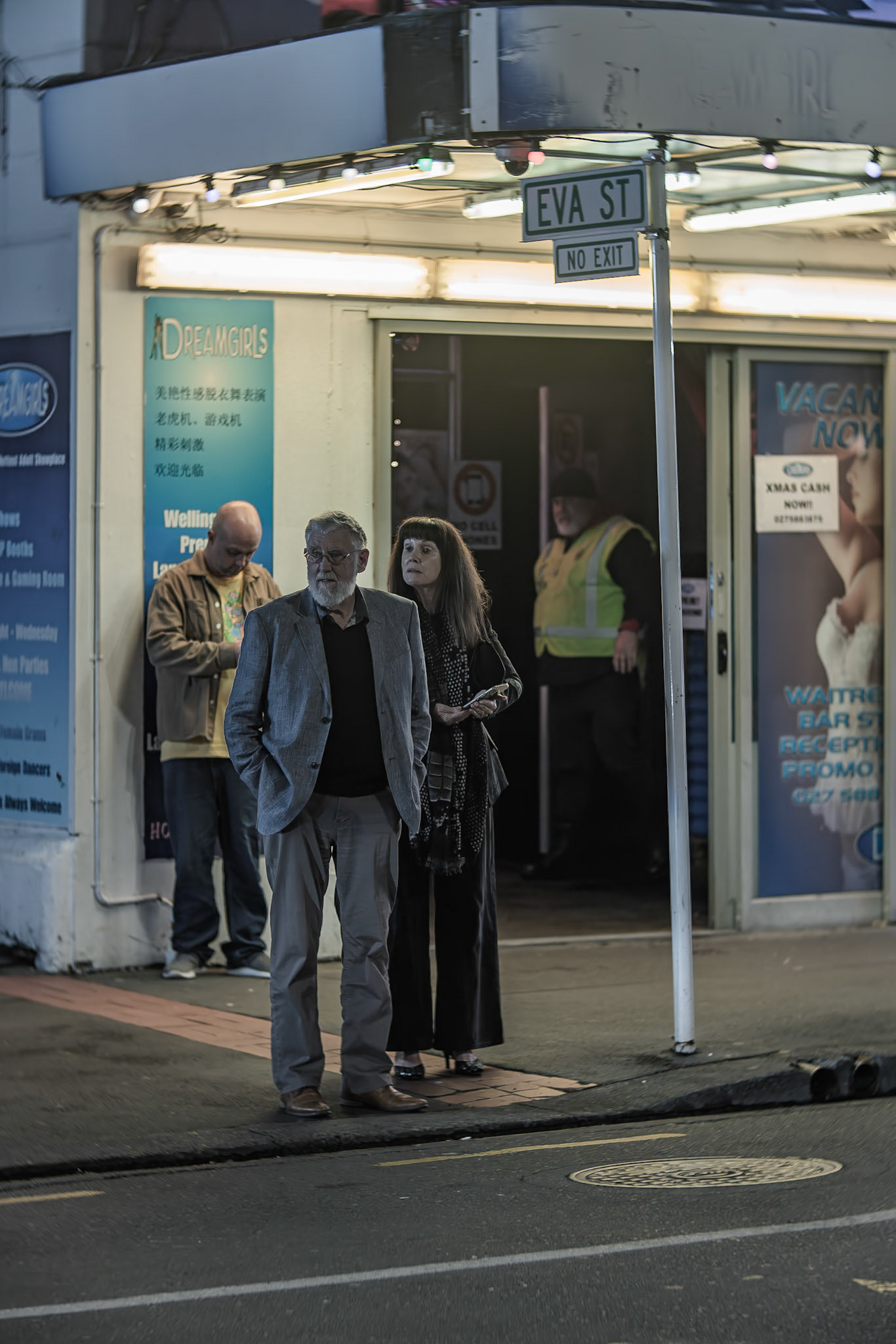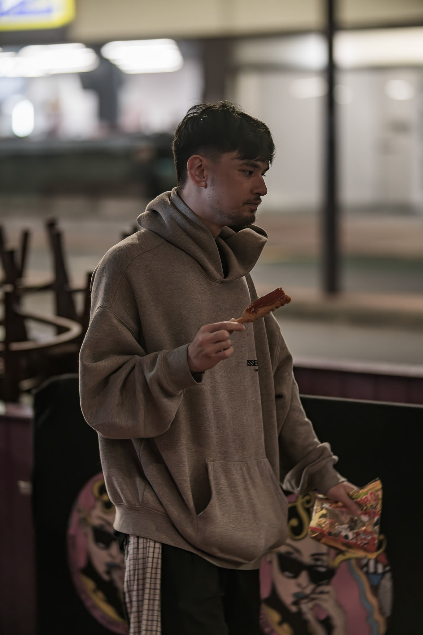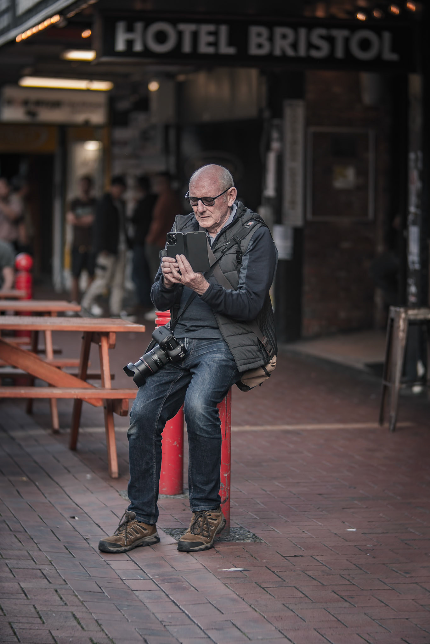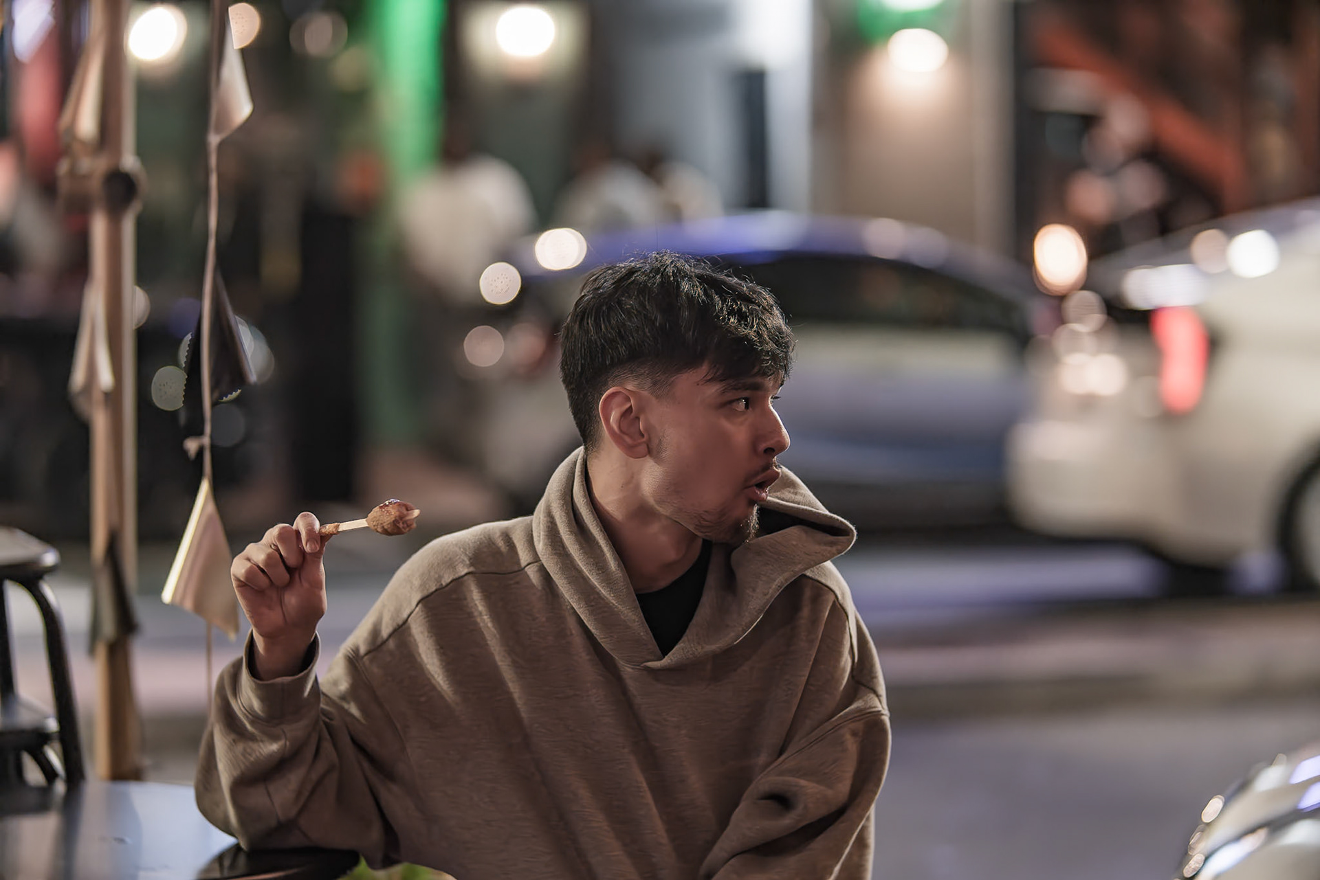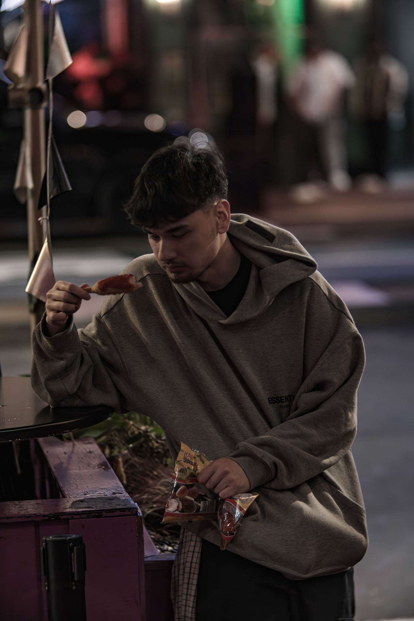 Unknown man enjoying drunk food outside Shady Lady Bar on Courtney Place